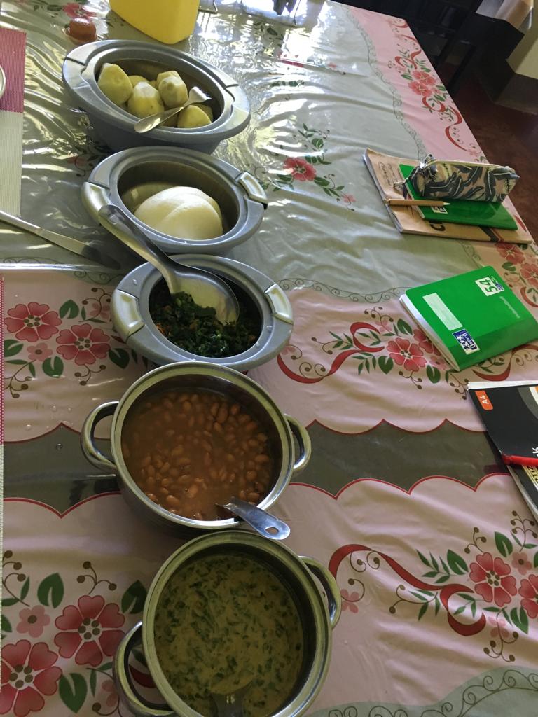 Unser Tag beginnt meistens mit Toast und Tee/Kaffee, dazu gibt es Avocado und Odi (Erdnussmuß). Odi wird sowohl für süße, als auch für herzhafte Gerichte verwendet. Oft gibt es auch Chapati (Teigfladen in Öl gebraten) oder „Rolex“ (ein Omelette eingerollt in Chapati: „Rolex“ ist die mundläufige Abkürzung für „rolled eggs“). Chapati und Rolex bekommt man hier als „street food“ an jeder Straßenecke für wenig Geld. Die Ugandis essen auch gerne deftige Sachen zum Frühstück, wie z.B. Süßkartoffeln, Kürbis oder Cassava mit Odi. Nicht selten auch ein Stück Fleisch dazu.