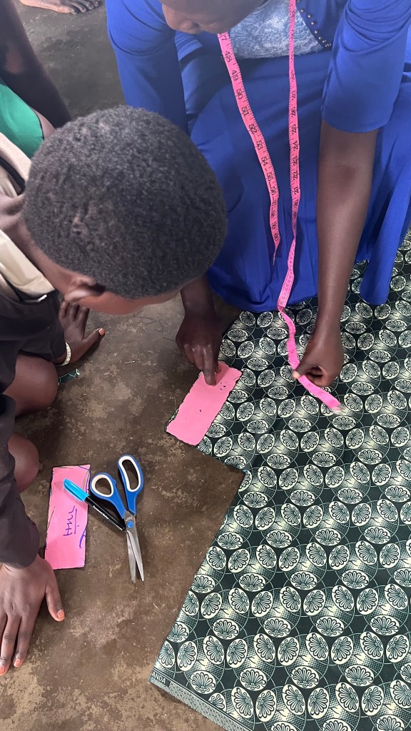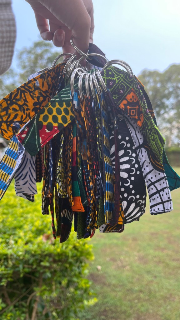 Dabei geht es darum, dass die Schülerinnen und Schüler Schlüsselanhänger aus Kitenge* herstellen, die dann in Deutschland gegen eine Spende abgegeben werden.